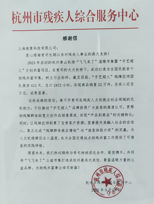 近日,南象科技荣幸地收到了来自杭州市残疾人综合服务中心的诚挚感谢信。信中对公司在杭州萧山机场“飞飞来了”温暖市集暨“手艺超人”文创共富项目中给予的鼎力支持表示衷心感谢。自2023年启动以来,在南象科技的助力下,该项目已成功打造为全国民航首个助残共富市集,运行至今,残障匠师团队已实现商品销售22万件,总收入近百万元。这一成绩不仅显著拓宽了残障群体的就业增收渠道,更通过推动“手艺超人”品牌获得广大旅客认可,帮助匠师们完成了从“产品到商品”的关键转化,为人文机场建设注入了持久的温度,也因此树立了可资借鉴的行业助残新标杆。